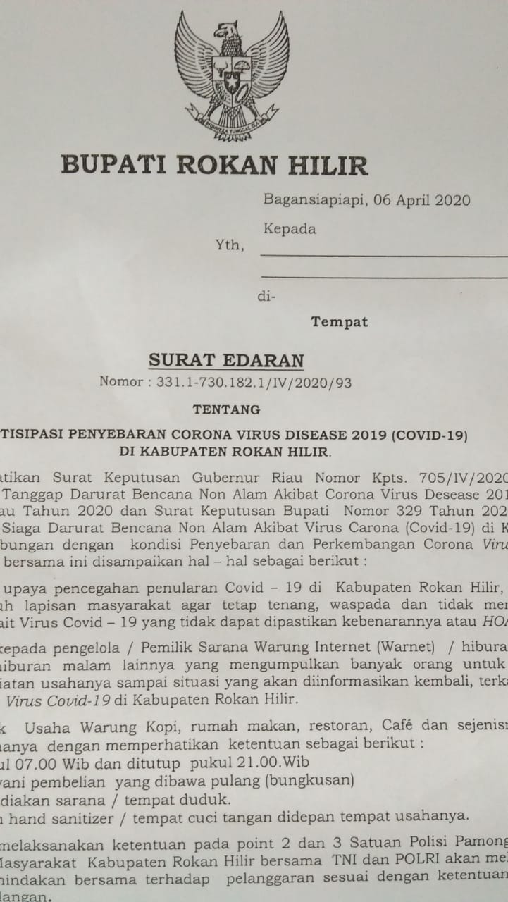 Rokan Hilir | metroinvestigasi.id – Menyikapi perkembangan penyebaran Covid- 19 di Riau serta memperhatikan dan menindaklanjuti Surat Keputusan Gubernur Riau No. Kpts. 705/lV/2020 tentang penetapan Status TANGGAP darurat Bencana Non Alam Akibat Corona Virus Desease ( Covid-19 ) di Propinsi Riau , akhirnya Bupati Rokan Hilir mengeluarkan SE atau SURAT EDARAN No. 331.1-730.182.1/IV/2020/93 tentang Antisipasi Penyebaran Corona Virus Desease ( Covid- 19 ) di Kabupaten Rokan Hilir.