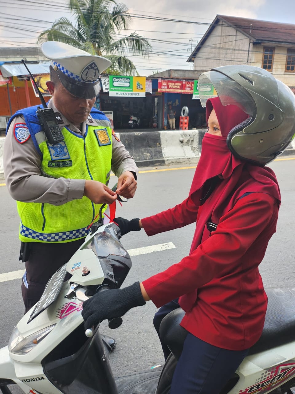 Selain pemasangan bendera merah putih untuk menyemarakkan rangkaian peringatan Hari Kemerdekaan 17 Agustus, personel Sat Lantas juga memasang brosur dan sticker pada kendaraan yang melintas sesuai SOP dan 3 S (senyum, sapa dan salam). (ar)
