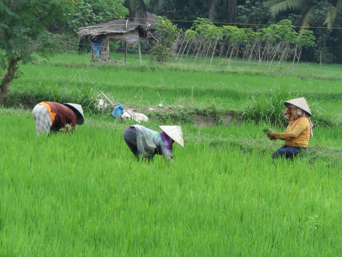 Beberapa wanita buruh tani tampak sibuk membersihkan lahan sawah sembari menjaga pasokan air agar bisa mengairi seluruh areal sawah, berharap air cukup untuk kebutuhan tanaman padi hingga musim panen nanti. Di tempat yang berbeda seorang wanita tengah baya yang biasa dipanggil Mbok Iyem (65) warga Nagori Margomulyo Kecamatan Gunung Malela Kabupaten Simalungun Sumatera utara, Ia rela bekerja di bawah teriknya panas matahari hanya untuk menunggu giliran dapat pasokan air di sawah lahannya sendiri pada hari Jumat, (13/03/2020 ).