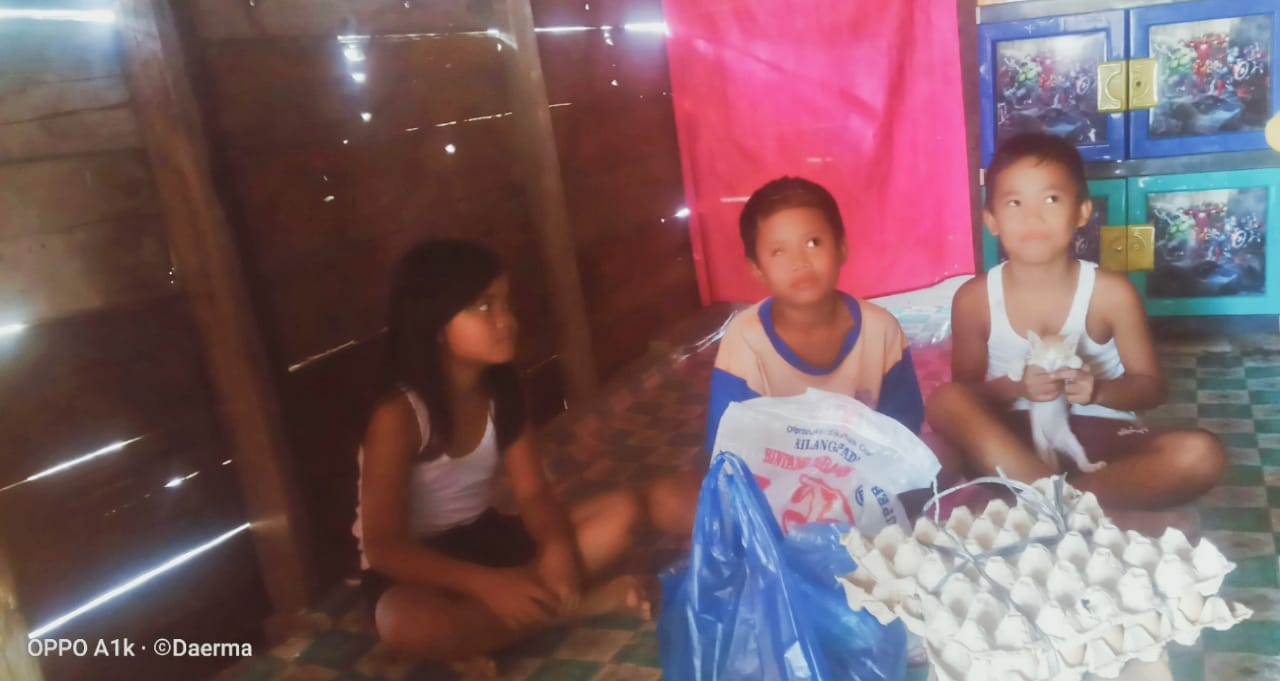 Namun sayangnya, saat pemberian yang diberikan dirumah Ibu Julianti itu posisinya tidak berada dirumahnya, melainkan masih mengutip berondolan sawit di kebun orang. Akhirnya diberikan paket sembako kepada ketiga anaknya yang masih kecil saat dirumah yang terbuat dari anyaman pohon sawit dan seng penuh lubang serta tampak kemiringan.