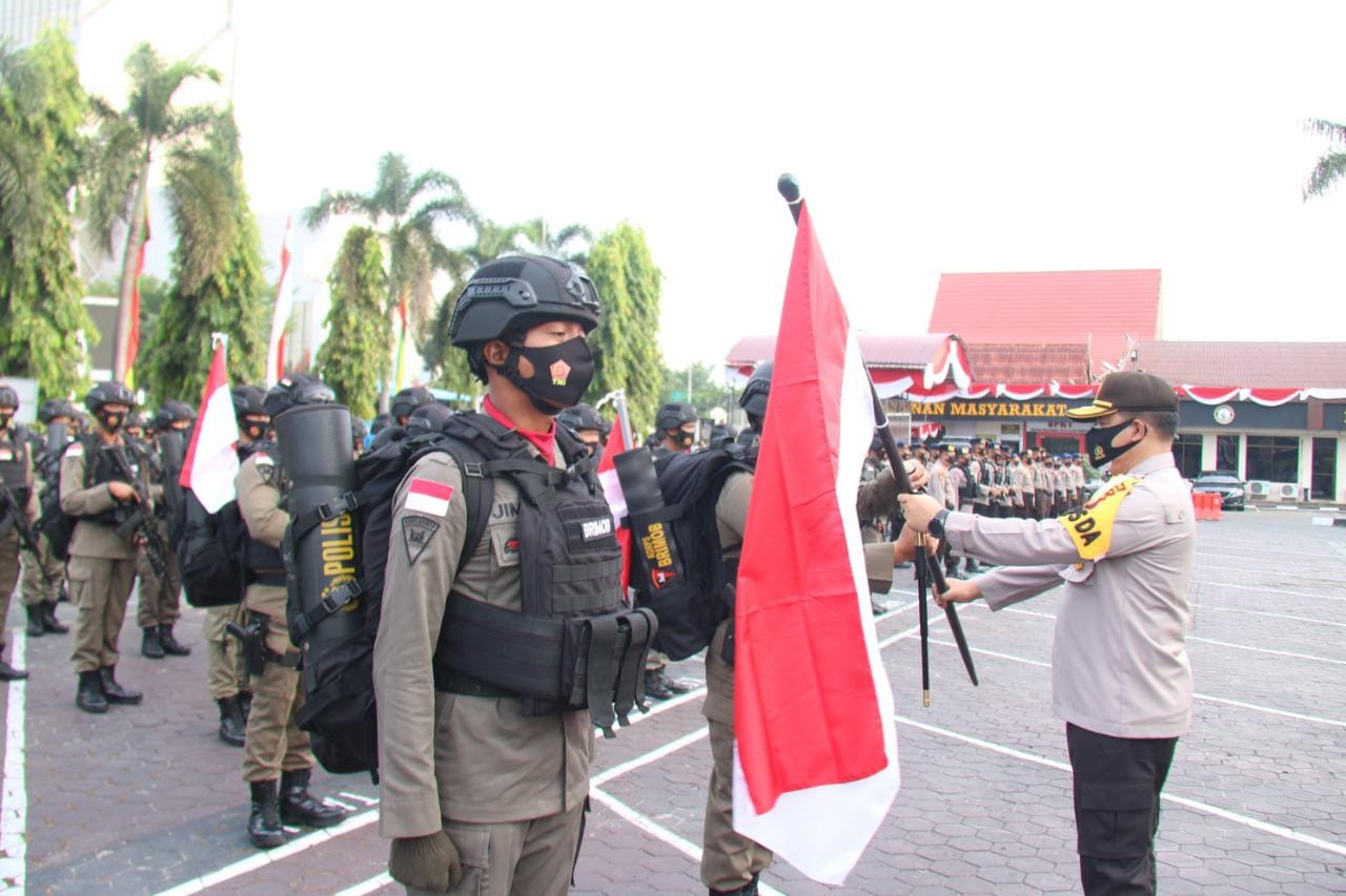 “Pagi ini saya melepas Penugasan 100 personel Sat Brimob Polda Riau untuk menjalankan tugas negara, saya berikan bendera merah putih ini sebagai lambang keutuhan NKRI, ini kita maknai sebagai panggilan tugas kepada Nusa dan bangsa dan kepada kesatuan Brimob. Kita adalah prajurit yang loyal kepada bangsa Indonesia, saya menekankan untuk menjalankan tugas ini dengan penuh tanggung jawab,” tekan Kapolda.
