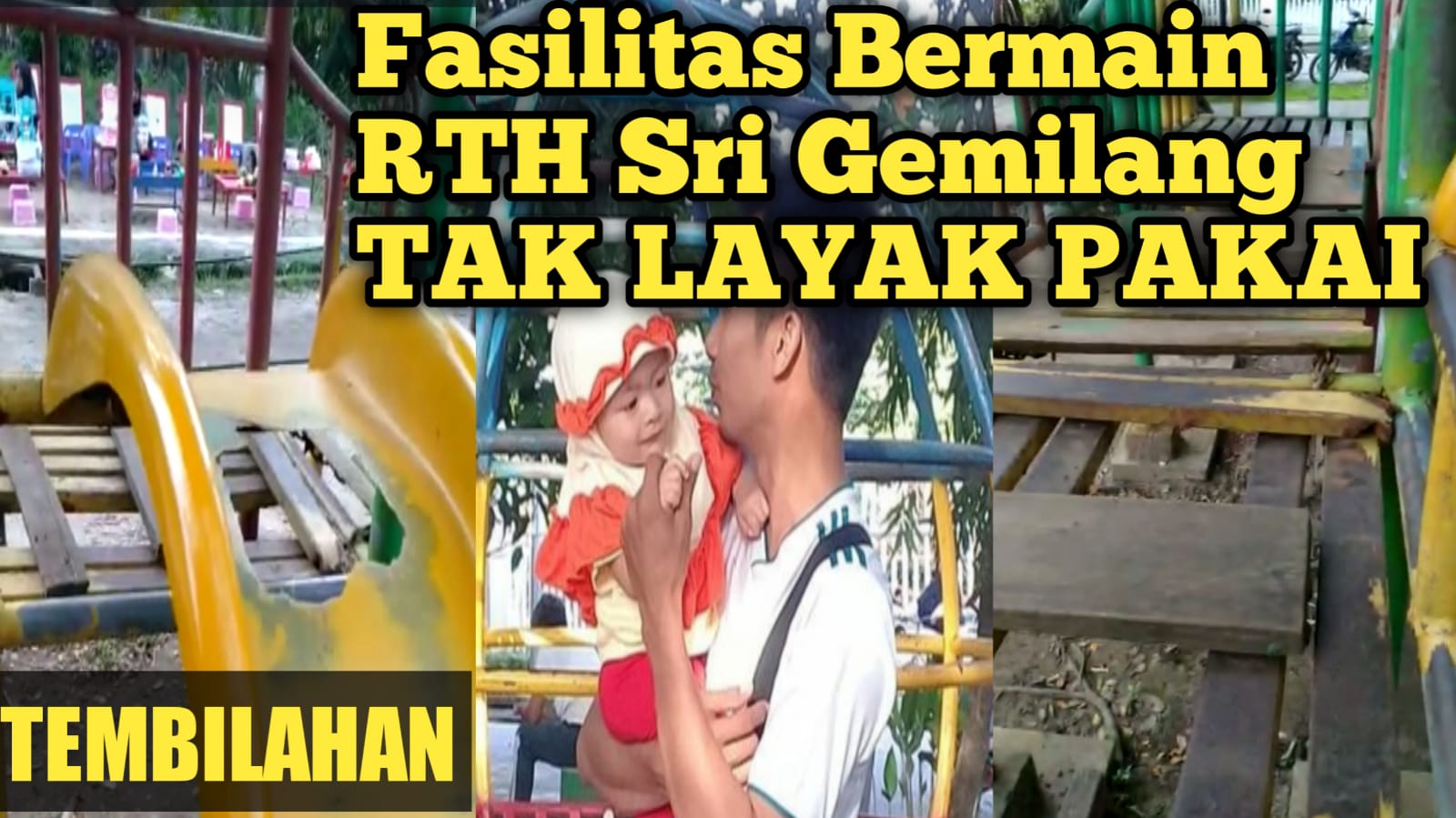 Vera pengunjung RTH Sri Gemilang (Taman Swarna Bumi) saat diwawancarai awak media di lokasi tersebut, Sabtu 19/11/2022 mengatakan, “Seluncuran taman ni berlubang-lubang, bahaya untuk keselamatan anak, coba bapak lihat tu, papanya bertali rapiah, lapok lagi, kalo anak jatuh bisa terbentur besi, batu atau terkilir, Parah Taman RTH ni.” Ujar Vera.