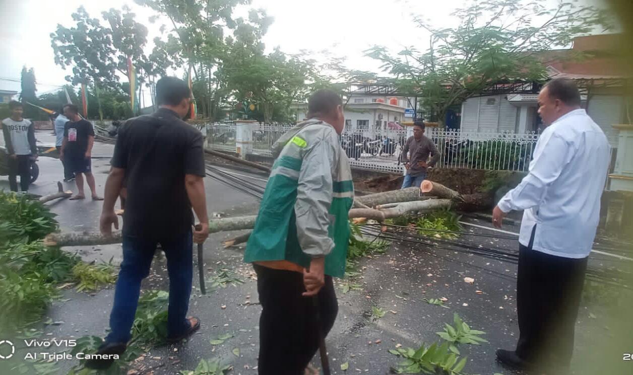 Adanya pohon tumbang pada saat hujan disertai angin kencang sore tadi, direspons oleh dinas lingkungan hidup (DLH) dengan menurunkan petugas pada tiga titik lokasi diantaranya di depan kantor Disperindag, Multi Marga dan samping RSUD.