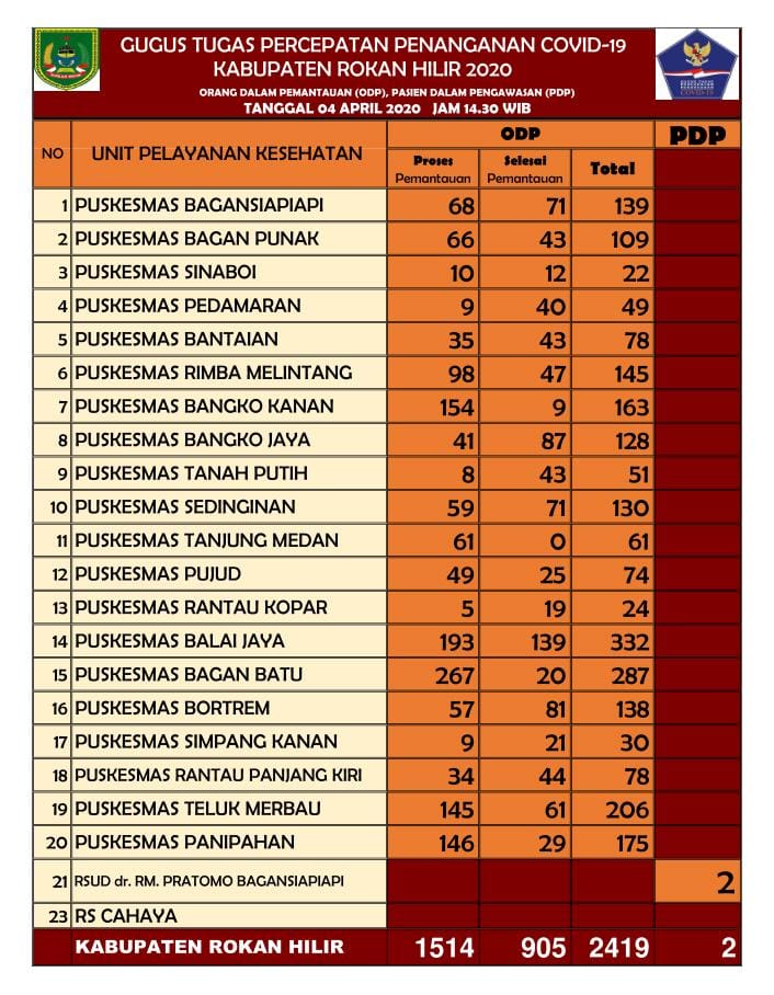 Jadi Total masyarakat Rohil yang telah dipantau oleh petugas kesehatan yang tersebar di 20 Puskesmas se Rokan Hilir sebanyak 2421 orang.